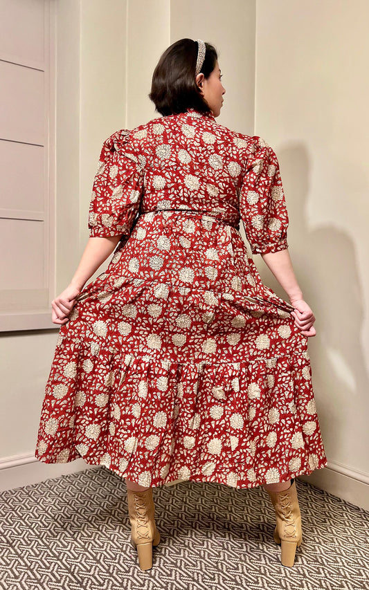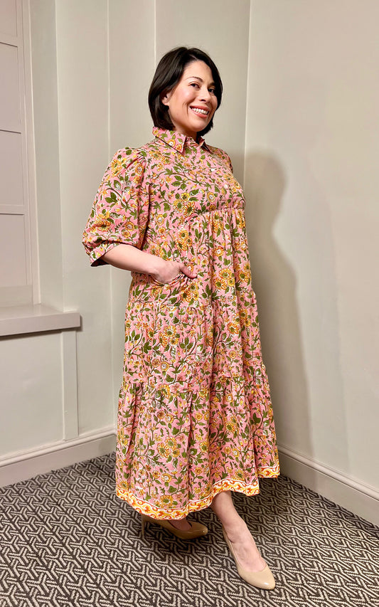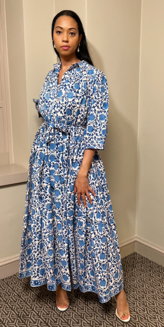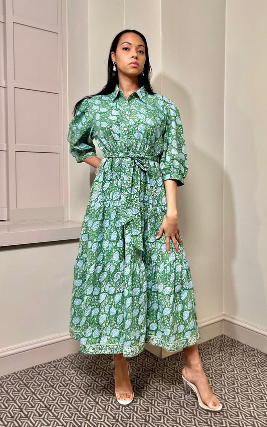 Emma Block Print Shirt Collar Cotton Midi Dress