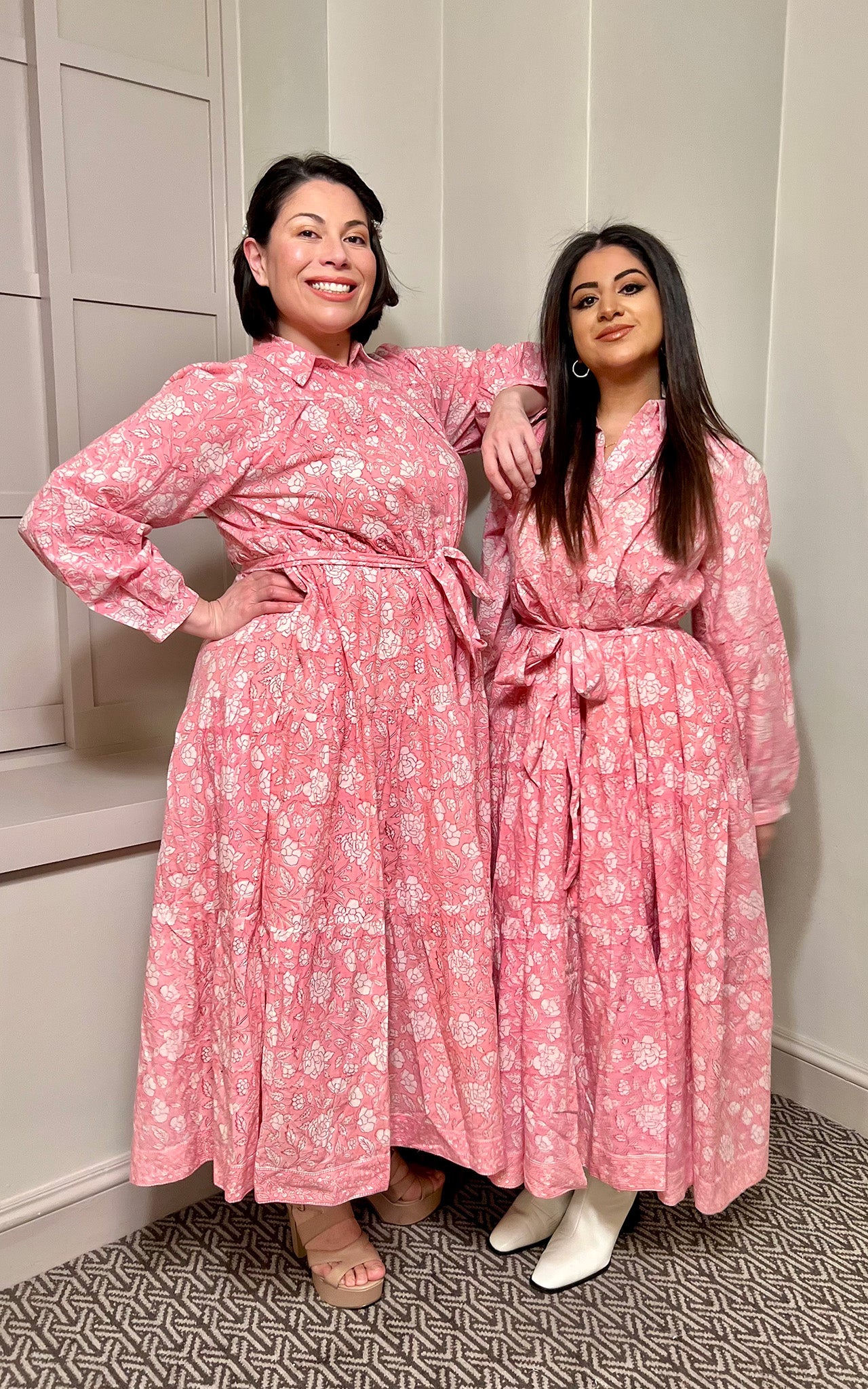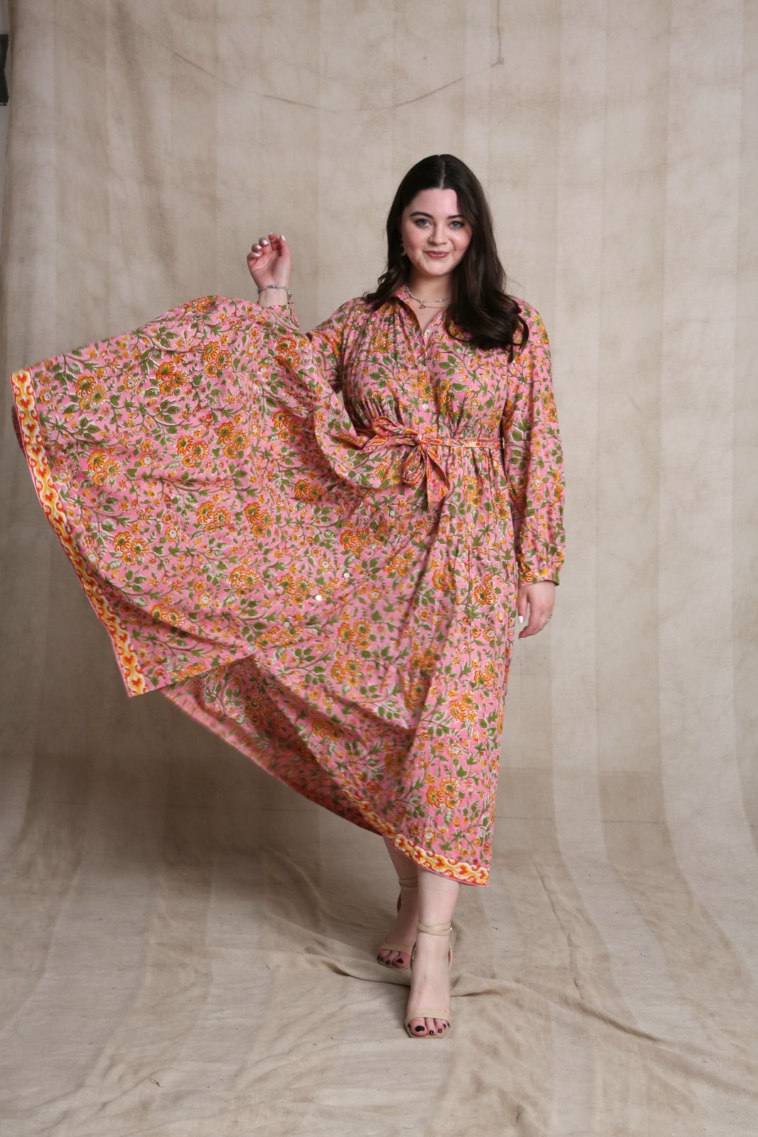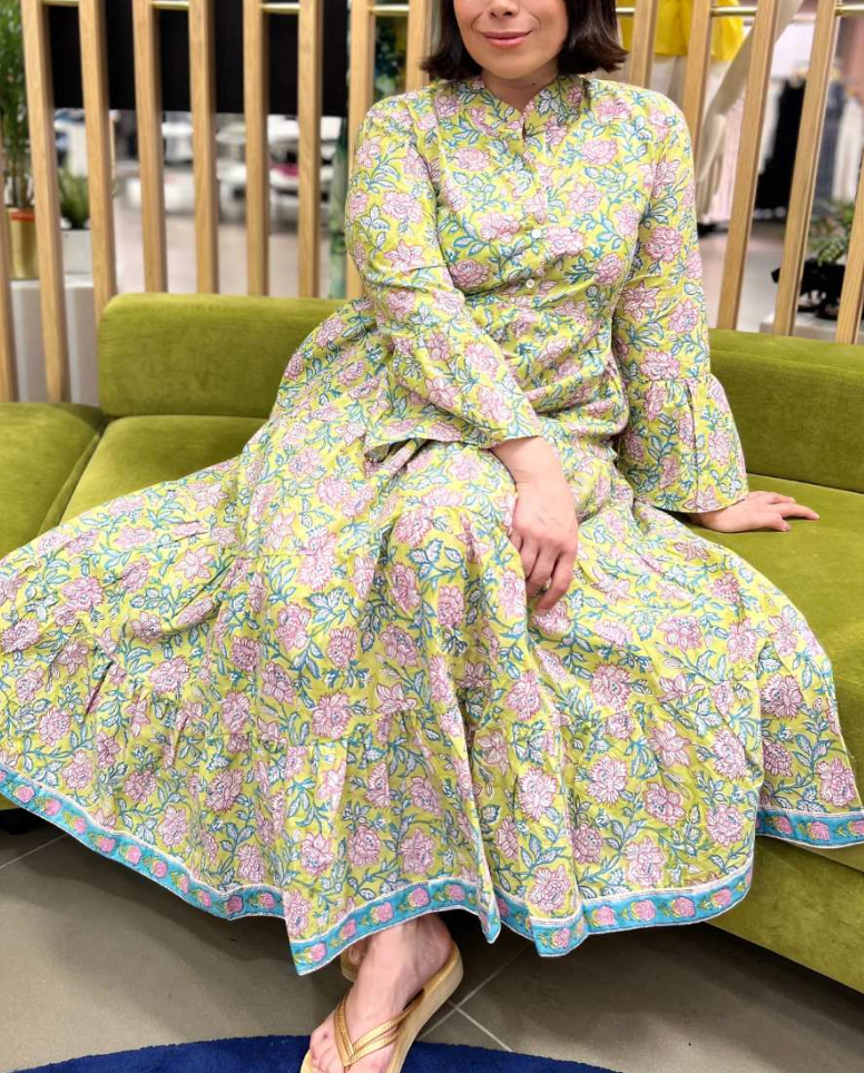 Introducing Emma, our beautiful floral-inspired, Aline maxi with playful buttoned sleeves and a comfortable fit. Its gorgeous block floral print makes it one of DF X Shannon's favourites, while its floaty silhouette is perfect for wearing on its own or layering.