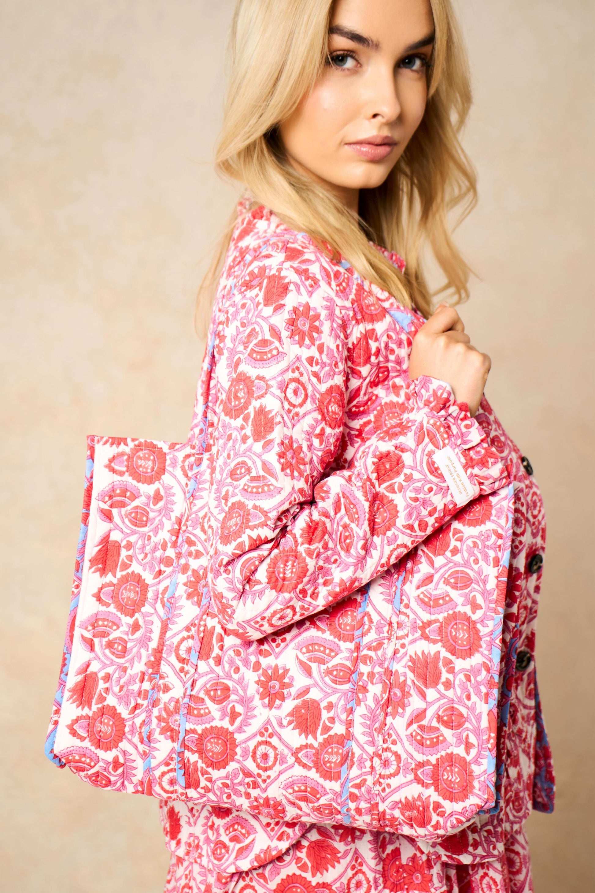 Elevate your day with the gorgeousness of block prints from our stunning quilted bag. This multi-use bag is a fashionable accessory and a practical addition to your lifestyle. Whether you need a fabulous shopping bag, a versatile tote, a functional baby bag, or a reliable gym companion, this bag has got you covered.